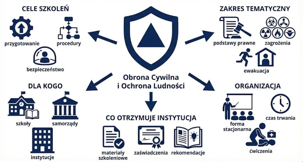 Prowadzimy specjalistyczne szkolenia z zakresu obrony cywilnej i ochrony ludności dla placówek oświatowych oraz jednostek samorządu terytorialnego. Programy opieramy na aktualnych wymogach prawa i zaleceniach organów odpowiedzialnych za bezpieczeństwo, przekładając je na czytelne procedury dla pracowników.